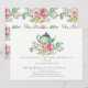 Pretty tea baby shower invitation featuring a green tea pot with beautiful pink watercolor flowers.