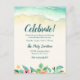 Modern beach themed Bat Mitzvah party reception insert card. Design features tropical watercolor flowers and ocean waves on the sand.