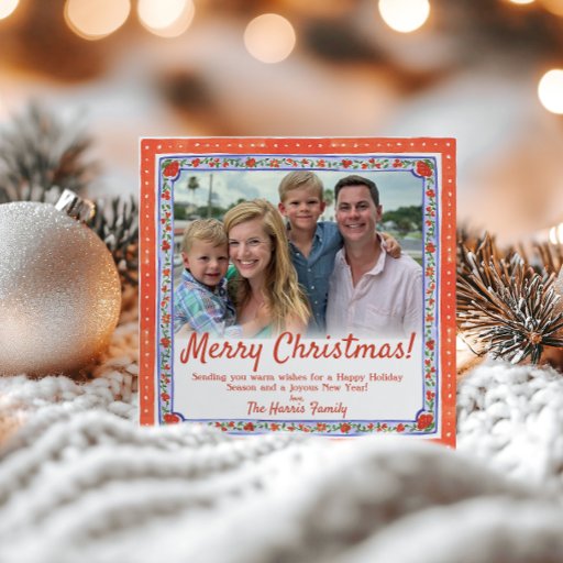 Watercolor Floral Block Print Photo Christmas Card