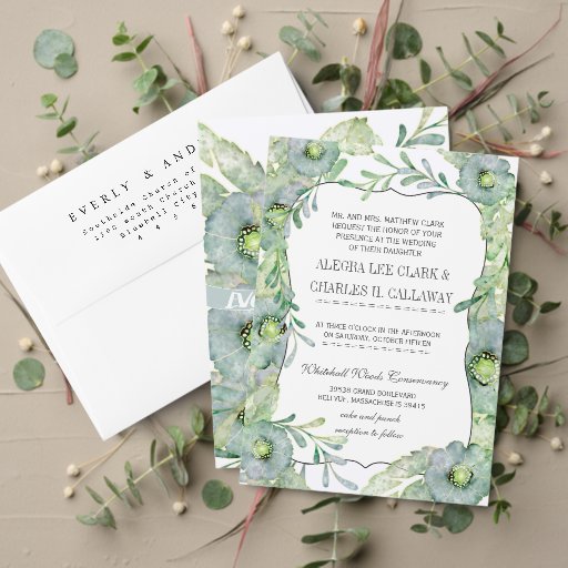 Watercolor Floral Blue and Green Wedding Invitation