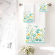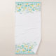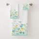 Bath towels with a watercolor floral border in turquoise blue and yellow. Beautiful for sporing and summer - Kate Eden Art.