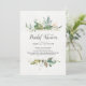 Delicate flowers and greenery provide a lovely backdrop for your bridal shower invitation. Peach, yellow, and green watercolor flowers on a solid white background contrast nicely with the green watercolors on the reverse side. On the front, the gold (faux glitter) in between the flowers and the text provides a pop of elegance.