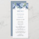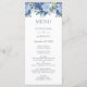 A beautiful wedding menu featuring a floral top border of watercolor flowers in shades of blue. The word "Menu" and the names of the bride and groom appear in dusty blue serif font, with the menu in charcoal grey. The back of the card is a matching shade of dusty blue.