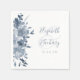 These elegant modern wedding napkins feature a dusty blue watercolor floral bouquet on the left edge. Easily customise the dusty blue text on a white background, with the names of the bride and groom in handwriting calligraphy over a large, pale blue ampersand.