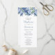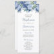 A beautiful wedding program featuring a floral top border of watercolor flowers in shades of blue. The names of the bride and groom and the subheadings appear in elegant dusty blue decorative script.