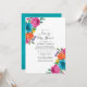 Watercolor floral fiesta drive through bridal or baby shower invitation with handwriting typography and turquoise watercolor wash reverse.