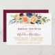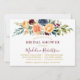 Modern Elegant Watercolor Floral and Greenery Bridal Shower Invitation includes golden yellow, peach, blue, burgundy red flowers roses and botanical greenery. Gold Text. Burgundy Back.