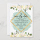 Simply elegant floral rustic bouquet design in watercolor (watercolour) green greenery, pink, beige, champagne, vanilla, ivory white flowers on white background and watercolor wash mint green with faux gold foil frame. Delicate save the date invitations for that spring or summer wedding theme. Back of card has mr. & mrs. names. See all wedding stationary collection.