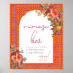 This fun summer bridal shower design has orange, pink and purple accents. The background is a geometric orange and magenta pattern with overlaying watercolor flowers including roses and wildflowers.