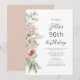 The left-hand edge of this birthday party invitation features a watercolor floral bouquet of peach and blush flowers and greenery. The customisable text combines script and sans serif fonts in charcoal grey on a white background. The reverse side features a coordinating solid colour. You can edit the text for any birthday year.