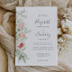 The left-hand edge of this romantic wedding invitation features watercolor floral bouquet of peach and blush flowers and greenery. The customisable text combines handwriting, copperplate and italic fonts in charcoal grey on a white background. The reverse side features a coordinating solid colour.