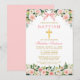 Elegant Watercolor Pink White Floral Baptism Invitation includes pink roses, white flowers and greenery. Gold Cross. Pink Blush Bow Ribbon.