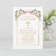 Elegant Watercolor Pink White Floral Baptism Invitation includes pink roses, white flowers and greenery. Gold Cross. Pink Blush Bow Ribbon. Gold Frame.