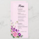 This Watercolor Floral Pink Violet Bold Modern Calligraphy Menu features roses, anemones, and orchids in bright colours with splashes of fresh greenery to enhance the bouquet style.