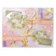 The design features a dreamscape design, a whimsical blend of different shades of light and dusty pink, watercolour flower bouquets in light pale pink, blue and purple, 2 enchanting rainbow butterflies and gold tree. All blended together with beautiful gold pearls. The background behind this beautiful collage, is a gradient light pink purple background, with pink stripes decorated with white flower Chintz Art design.