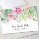 Fun Trendy Elegant Palm Floral Watercolor Tropical Guest Book. Perfect to use as a wedding guest book, or even for as a beach house guest book. With pink and green botanical accents and purple lettering. A tropical design that embraces the tranquil beauty of nature mixed with a playful edge that is sure to help you have fun. A blend of calming green tropical leaves, including banana leaves, palms, monstera leaves, and pink princessa plants, alongside soothing purple-pink orchid flowers, intertwined with various other foliage. Enhanced by a modern handwritten or script typography font, this enchanting print radiates charm and sophistication. This versatile design brings a sense of tropical paradise to any setting or special occasion, making it perfect for a destination wedding, or just when you want to add a tropical flare.