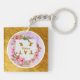 Carry a piece of elegance wherever you go with this stunning personalized floral keychain. This double-sided keyring features a delicate pink watercolor flower wreath set against a soft lavender backdrop, all beautifully encased in a luxurious brushed gold-style frame.
