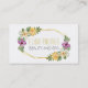 Lovely floral Beauty and Spa feminine business cards featuring beautiful white, yellow and purple watercolor flowers and a gold foil polygon.