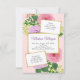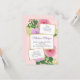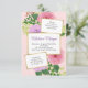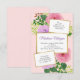 Watercolor pink and lavender flowers with green leaves on a rose gold background. All the details of the party are in white squares with a gold frame