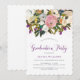 These stylish graduation party invitations feature lovely watercolor flowers in pink, grey, white, purple, and orange, and a spray of pink faux glitter. Elegant purple typography says "graduation party". Floral art by www.createthecut.com.