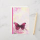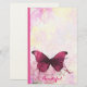 A beautiful painted purple butterfly which really captivates your attention. Set upon a delicate background which has a unique and creative watercolor texture with romantic pink and yellow faded flowers. With an antique logo faintly visible at the bottom to give it some vintage flair. At the bottom of this stationery is a little quote that says: Be your own kind of beautiful.
