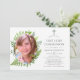 Trendy jasmine, eucalyptus, ivy and ferns wild woodland forest greenery first communion invitation card designed to be quickly and easily customised to your specifics. A portrait shaped photo is recommended.
