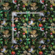 Watercolor painted pattern of green woodland plants, mushrooms, and colourful berries.