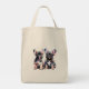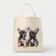 A whimsical watercolor illustration of two adorable French Bulldog puppies sitting side by side. The puppies have distinct black and brindle coats with expressive eyes and oversized ears. Their playful expressions convey curiosity and charm, set against a soft, abstract background that enhances their features. The overall mood is lively and heartwarming, perfect for showcasing the cuteness of these beloved dogs.
