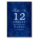 Watercolor Galaxy Cosmic Stars Starry Table Number. This design features twinkling star lights in space against a nebula starry sky of a celestial navy blue universe. Personalise this custom design with your own text and event details.