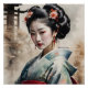 A watercolor Geisha exquisitely dressed in traditional kimono, cherry blossoms.