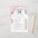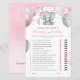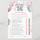 This Guess Who baby shower game card features pink and grey baby girl elephant with balloons and confetti. You can personalise the game questions by clicking the "Personalise" button.