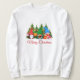 Merry Christmas Colorful Fun Watercolor Gnomes with Christmas Presents Holiday Sweatshirt with Pine Trees and String Lights.