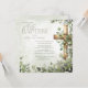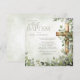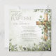 A modern watercolor invitation for the holy baptism in soft sage green colours and light green background. Designed for a baby boy baptism, featuring a sweet illustration of flowers next to a wooden cross. Invite your friends and family to your holy baptism in style with this pretty card. The use of script and classic serif font creates elegant modern look.