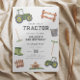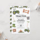 This modern invitation features watercolor tractor and farm illustrations and distressed construction style fonts.