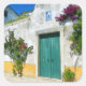 Watercolor green wooden door with colourful flowers in blossom in a Mediterranean village