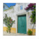 Watercolor green wooden door with colourful flowers in blossom in a Mediterranean village
