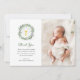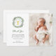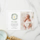 This simple and minimalist Baptism or Christening thank you card features an elegant watercolor wreath full of rustic greenery and foliage, with an illustration of a Chalice and subtle green watercolor splash in the centre, on a white background. Your baby's photo is also featured.