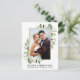 Elegant Watercolor Winter Greenery Merry Christmas Wedding Photo Newlywed Holiday Postcard includes eucalyptus leaves and red holly berries. Gold Frame.
