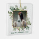Elegant Watercolor Winter Greenery Mr. and Mrs. Wedding Photo Newlywed Christmas Ornament includes eucalyptus leaves and red holly berries. Green Text. Gold Frame.