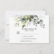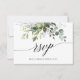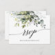 Modern Calligraphy Script Elegant Watercolor Botanical Greenery Wedding RSVP Card includes eucalyptus leaves, green botanical foliage, dusty blue leaves and other beautiful botanical greenery.