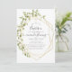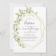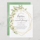 Trendy sage green and white watercolor leaves baptism invitation with gold geometric frame and elegant handwriting typography.