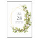 Trendy sage green and white watercolor leaves wedding table number cards with gold geometric frame.