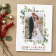 Elegant Watercolor Winter Greenery Merry Christmas Wedding Photo Newlywed Holiday Postcard includes eucalyptus leaves and red holly berries.