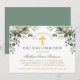 Modern Elegant First Holy Communion Invitation includes watercolor eucalyptus leaves and other beautiful botanical greenery foliage. Sage Green Back. Gold Cross.