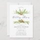 Green and white wedding shower invitation featuring ferns, wildflowers and strawberries and a sage green watercolor wash background.