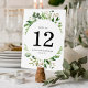 Stylish botanical table number cards featuring your table number, names, and wedding date surrounded by painted watercolor foliage in vibrant shades of spring and moss green. The botanical table numbers are designed to coordinate with our Watercolor Greenery wedding collection. Add each table number card to your cart individually.
