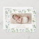 Elegant and whimsical photo birth announcement featuring watercolor pattern of greenery and white flowers. This greenery photo birth announcement is perfect for gender-neutral baby birth announcements. Personalise by adding photos and details.