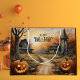 Halloween gift bag featuring a watercolor image of a haunted farmhouse on an eerie autumn evening with bats flying about and lit pumpkins to greet you in the foreground. Happy Halloween greeting in a spooky font near the top centre of sign. Additional sizes available. Image may need to be adjusted for varying sizes.