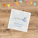 Celebrate your little boy's first birthday with this cute air travel-themed paper napkins, featuring a wolf flying an helicopter with colourful buntings and soft watercolor clouds. Personalise the text to suit your party details.