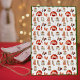 Christmas holiday gift bag featuring a watercolor snow ski theme pattern - ski sweaters, ski boots, winter hats and mittens in watercolor greens and reds and delicate snowflakes repeated throughout pattern. A solid green background to match illustration.